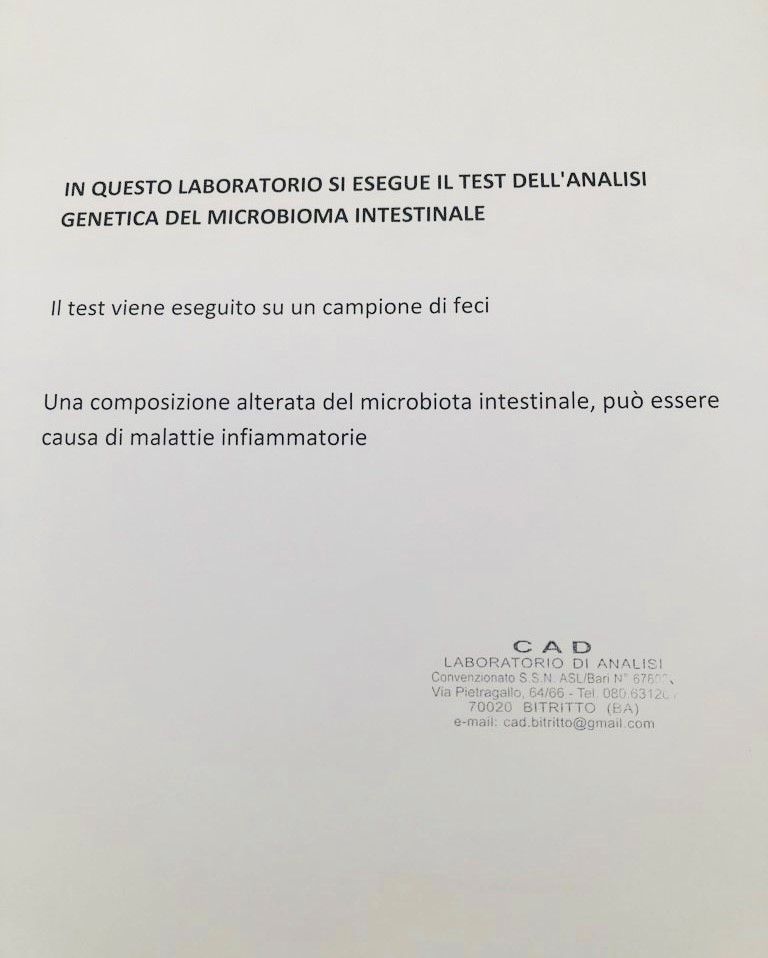 CAD – Centro Analisi e Diagnostica da oltre un decennio opera quale laboratorio di analisi regolarmente accreditato presso la Regione Puglia con il numero di convenzione 676022; dopo vari trasferimenti di proprietà, dal 15 marzo 2016 la società è stata acquisita interamente da “Giba Lab Srls”, con sede in Triggiano (BA) al Viale Aldo Moro n.78
